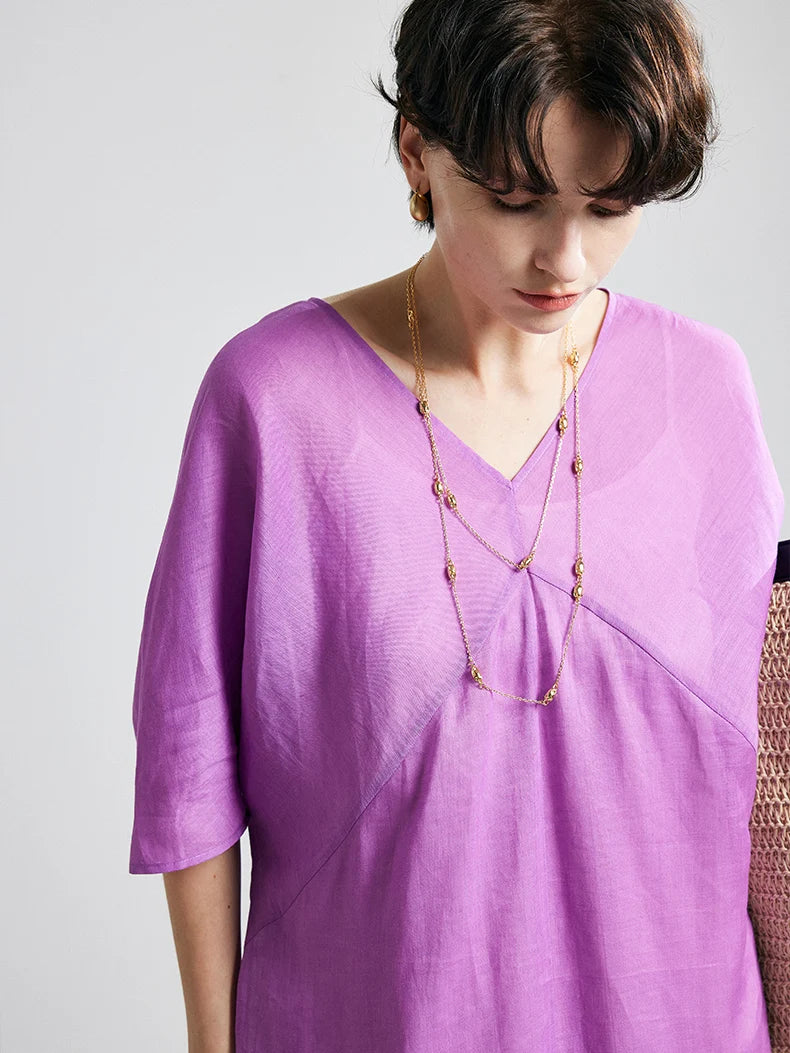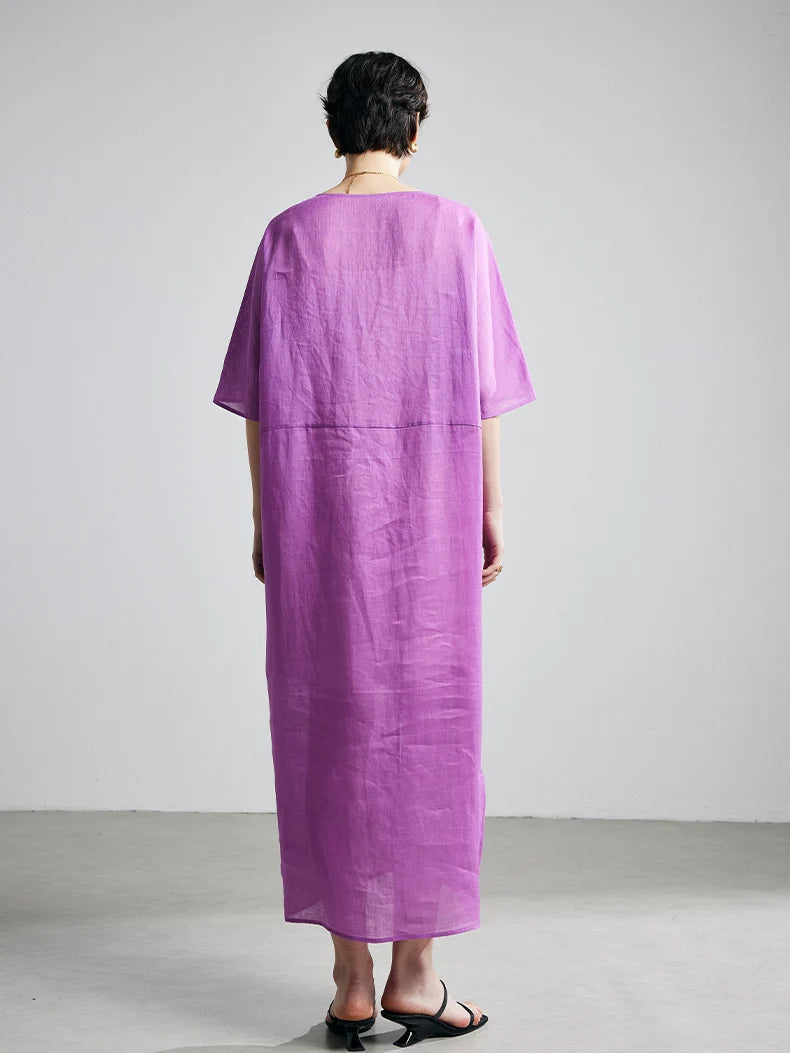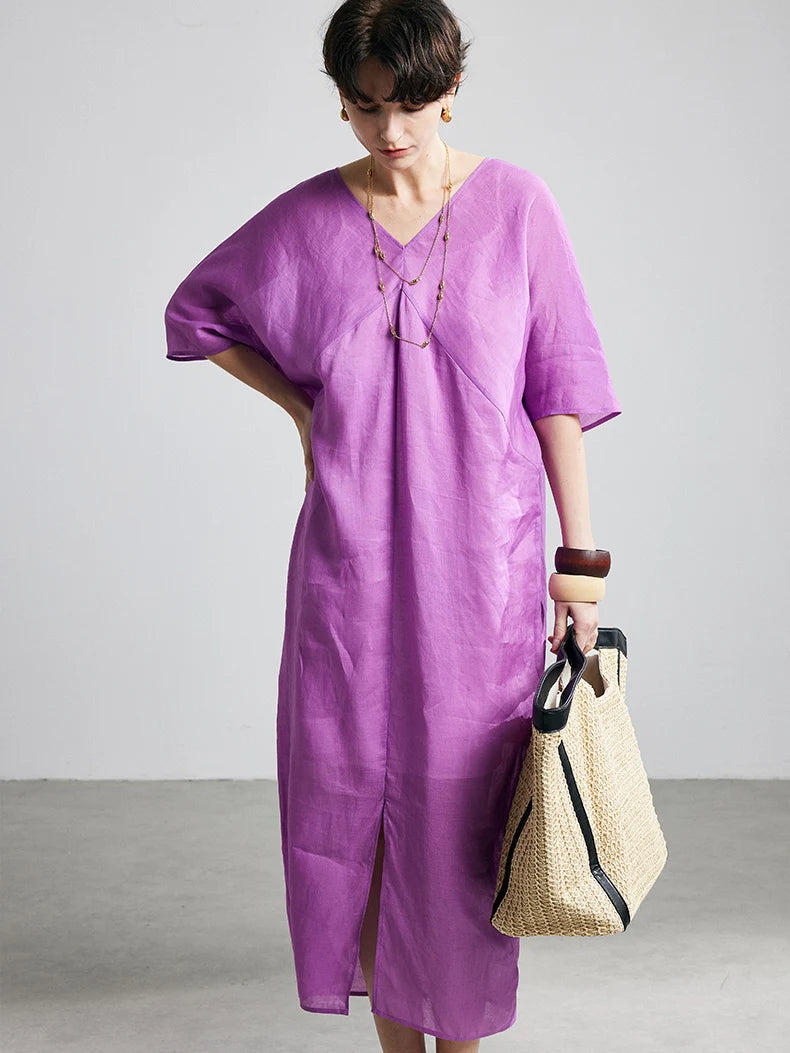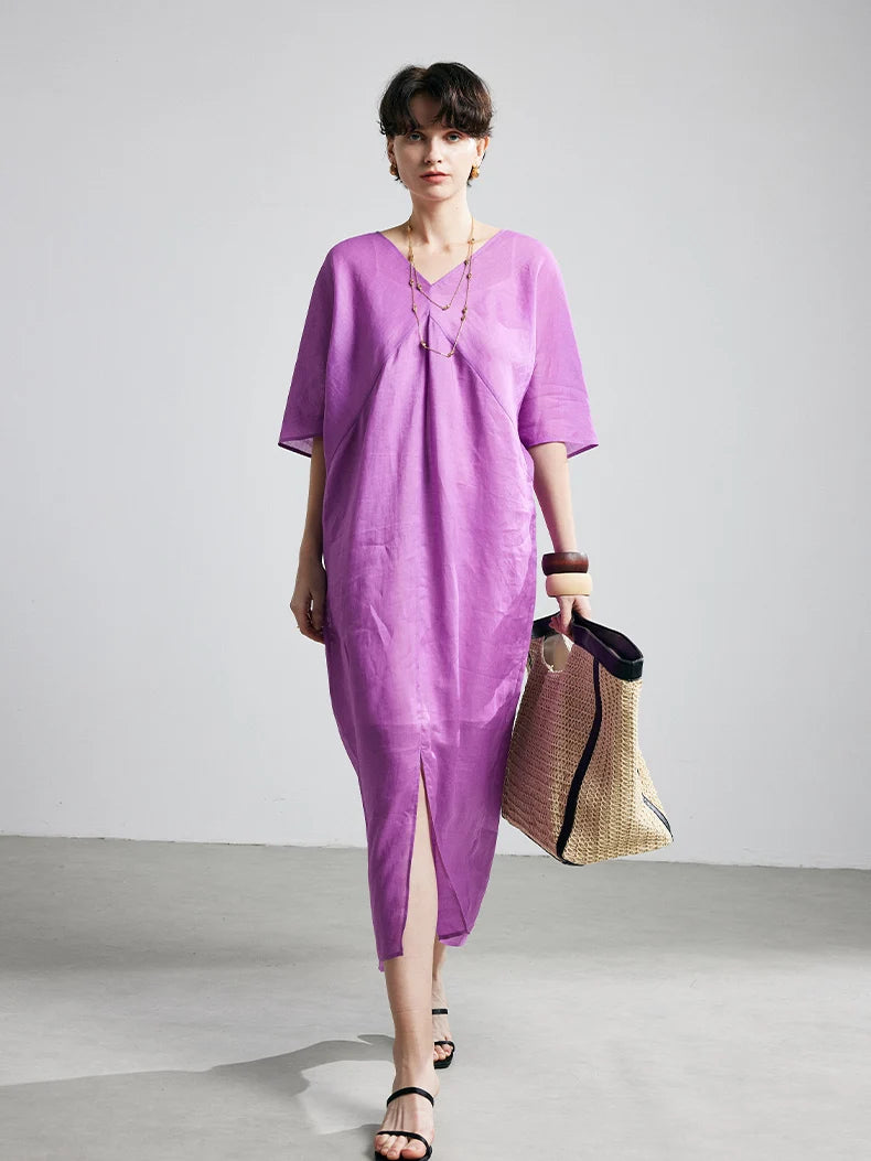 100% Ramie Maxi Dress – Women's V-Neck Solid Long Dress in Rose Purple