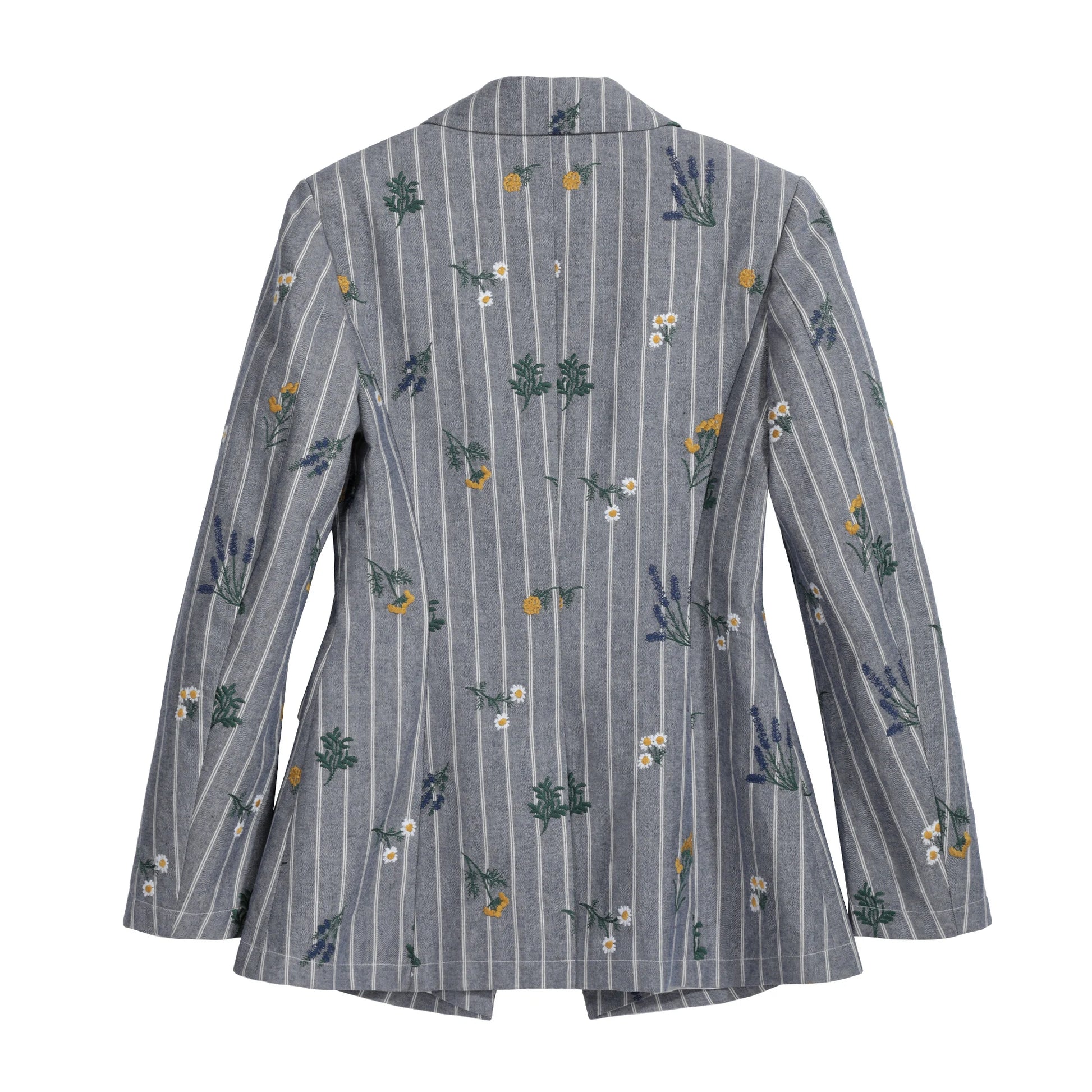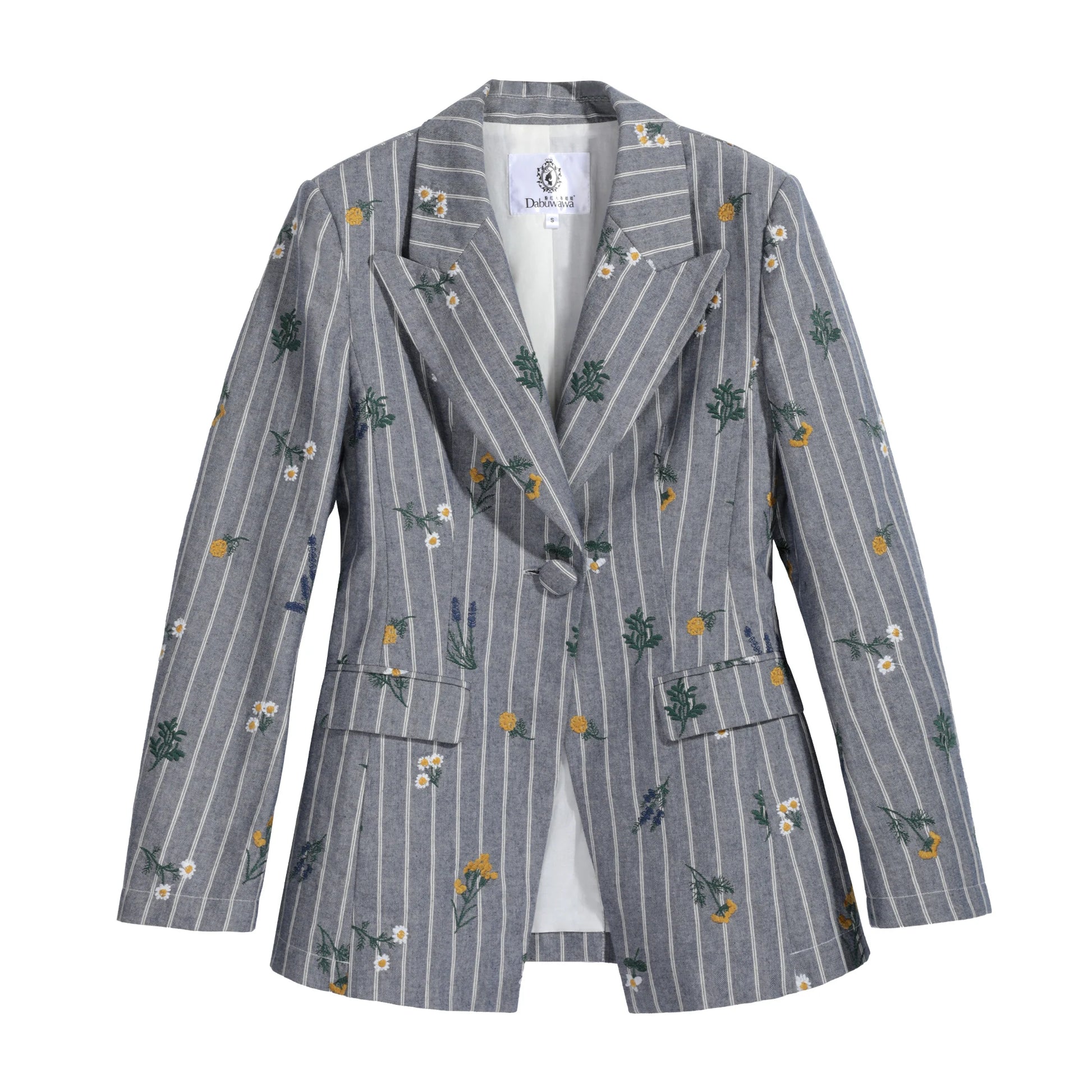 Effortlessly elegant and full of artistic charm, this Urban Bohemian Temperament Blue Striped Embroidered Blazer is designed for women who balance creativity with confidence. Crafted from a breathable cotton-linen blend, it features exquisite floral embroidery that adds a touch of femininity to its structured silhouette. The notched collar and single-breasted design create a refined yet relaxed style, making it perfect for both professional and casual autumn looks. Pair it with jeans for a chic city vibe or match it with the coordinating shorts (DM2CSP003, sold separately) for a complete bohemian set.