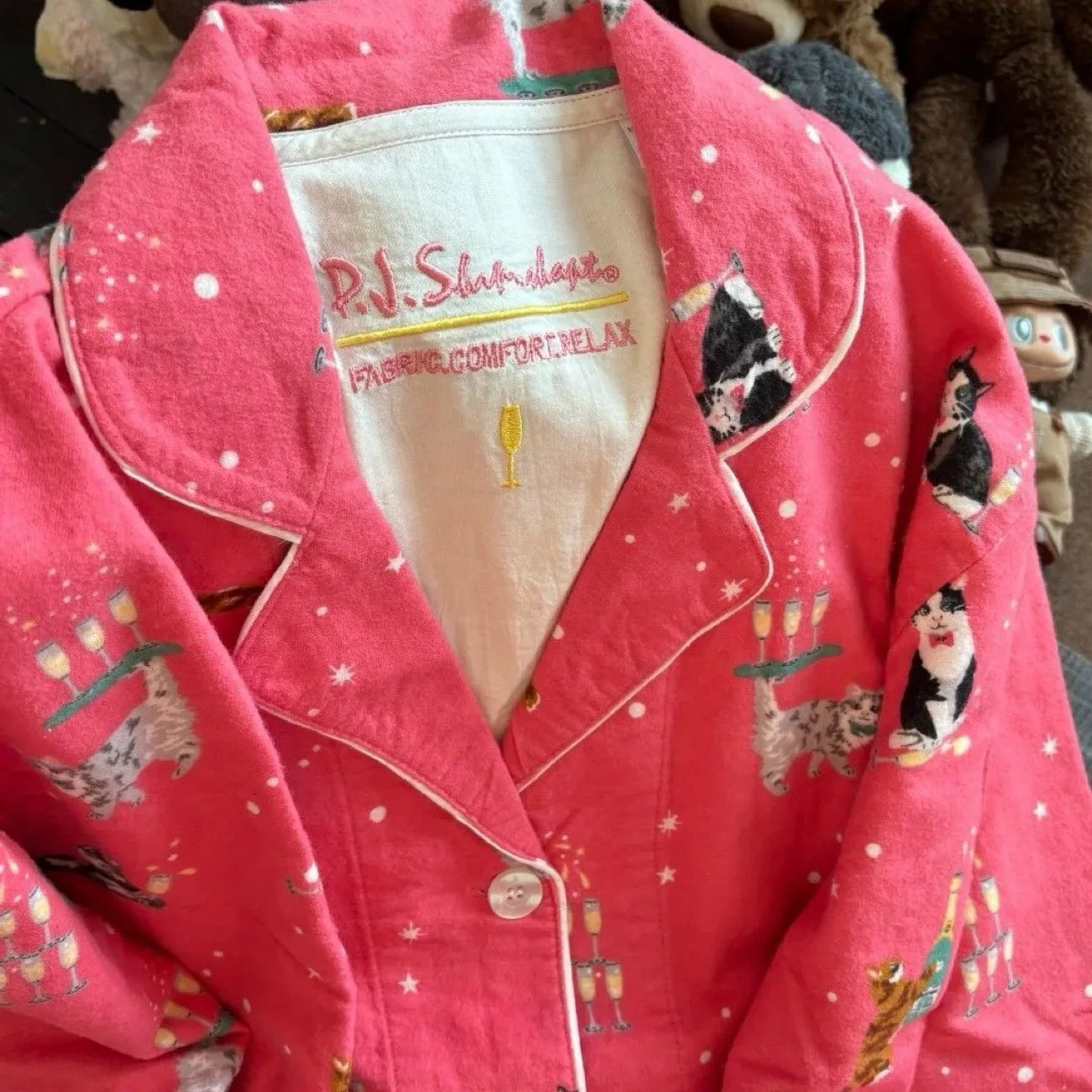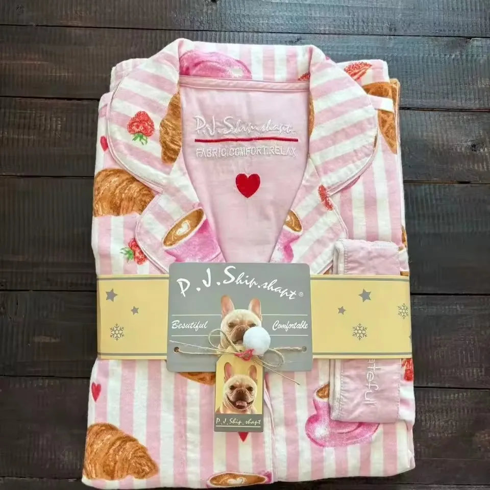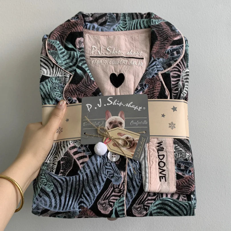 Stay cozy and comfortable with this women’s cotton pajama set, designed for relaxed evenings and restful nights. Featuring a playful cartoon pattern, a classic turn-down collar, and full-length sleeves with ankle-length pants, this set offers a soft, breathable feel ideal for everyday home wear. Made from 100% cotton, it provides natural comfort while maintaining a simple, timeless style—perfect for autumn and cooler seasons.