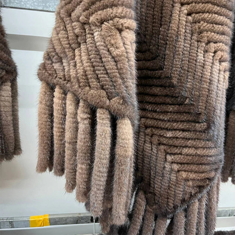 Women’s Real Mink Fur Knitted Cape – Luxury Striped Pullover Fur Coat with Tassel Trim, Warm & Elegant Overcoat