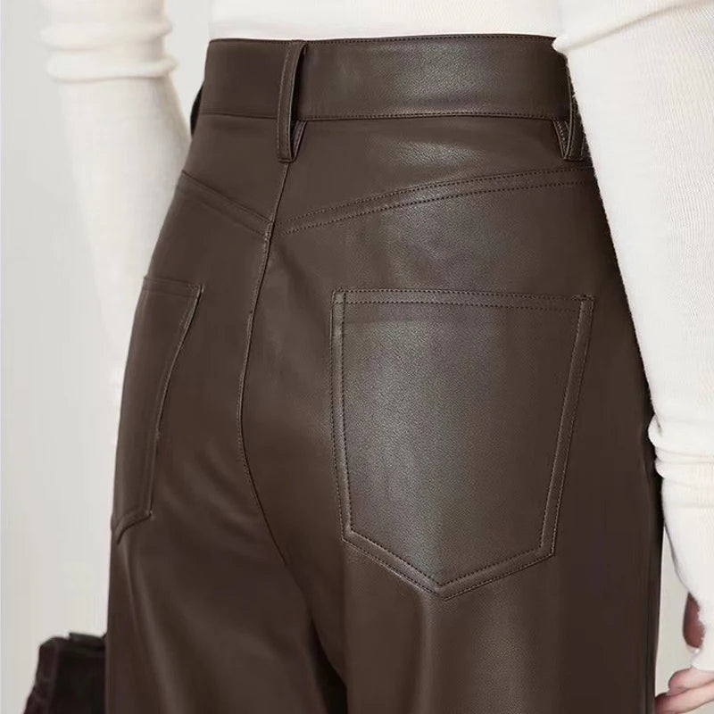 Genuine Sheepskin Leather Pants for Women Casual Loose Wide Leg Pants 2024 New Chic Lady Brown High Waist Ankle-Length Trousers