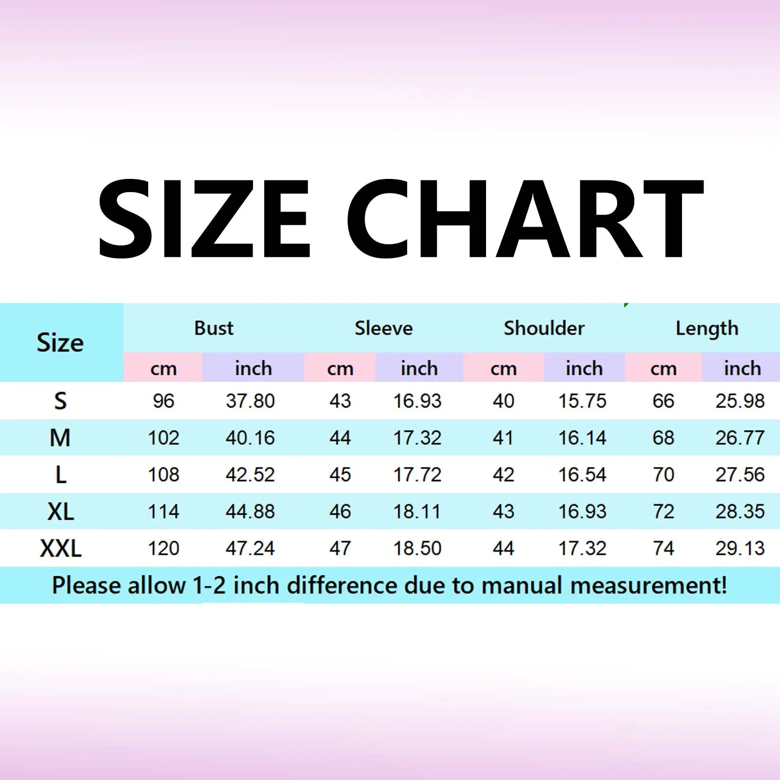| Size | Bust (cm/in) | Shoulder (cm/in) | Sleeve (cm/in) | Length (cm/in) |