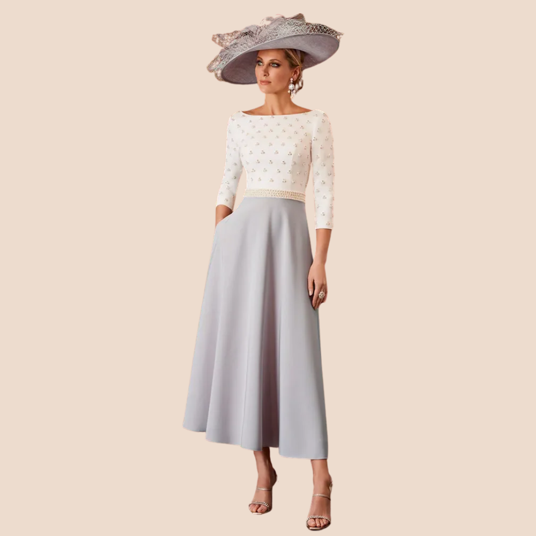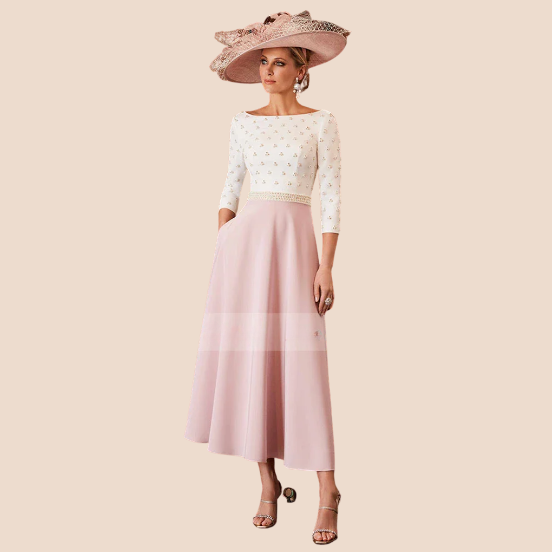 Luxury Tea-Length Mother of the Bride Dress – Elegant Midi A-Line Gown with 3/4 Sleeves for Weddings & Formal Events