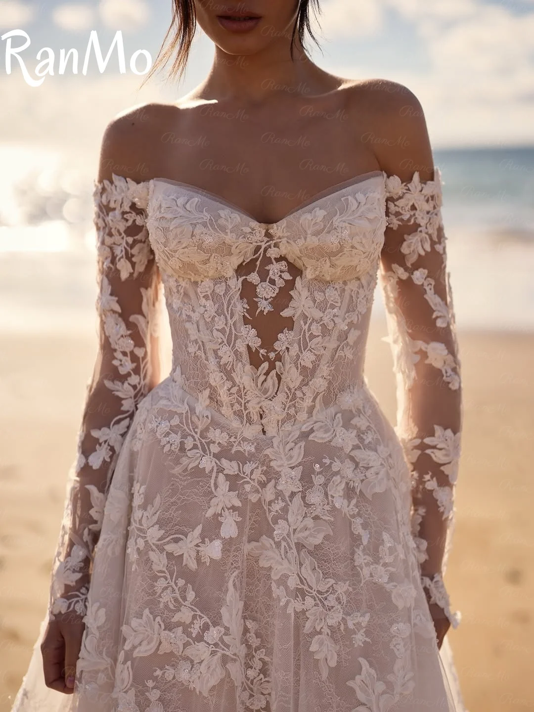 Ranmo New 2025 White A Line Wedding Dress Off Shoulder Long Sleeve Lace Wedding Gowns Luxury Boho Long Bridal Dress Customised