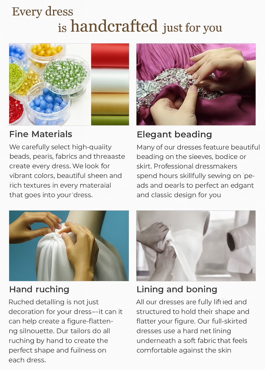 Custom-made dresses typically take 4–8 weeks to produce, depending on the design complexity. Shipping times vary based on your location, but we will always keep you updated.